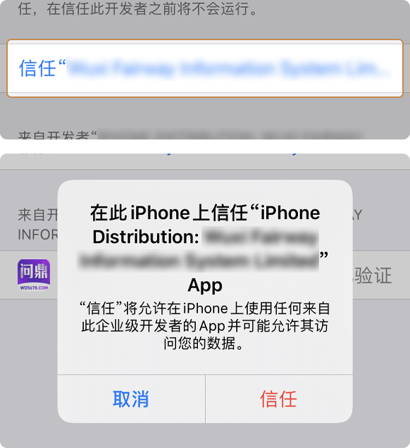 4.点击进入相应的企业级应用后,点击信任此应用,再在接下来弹框点击信任,返回桌面后即可正常使用APP。